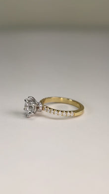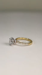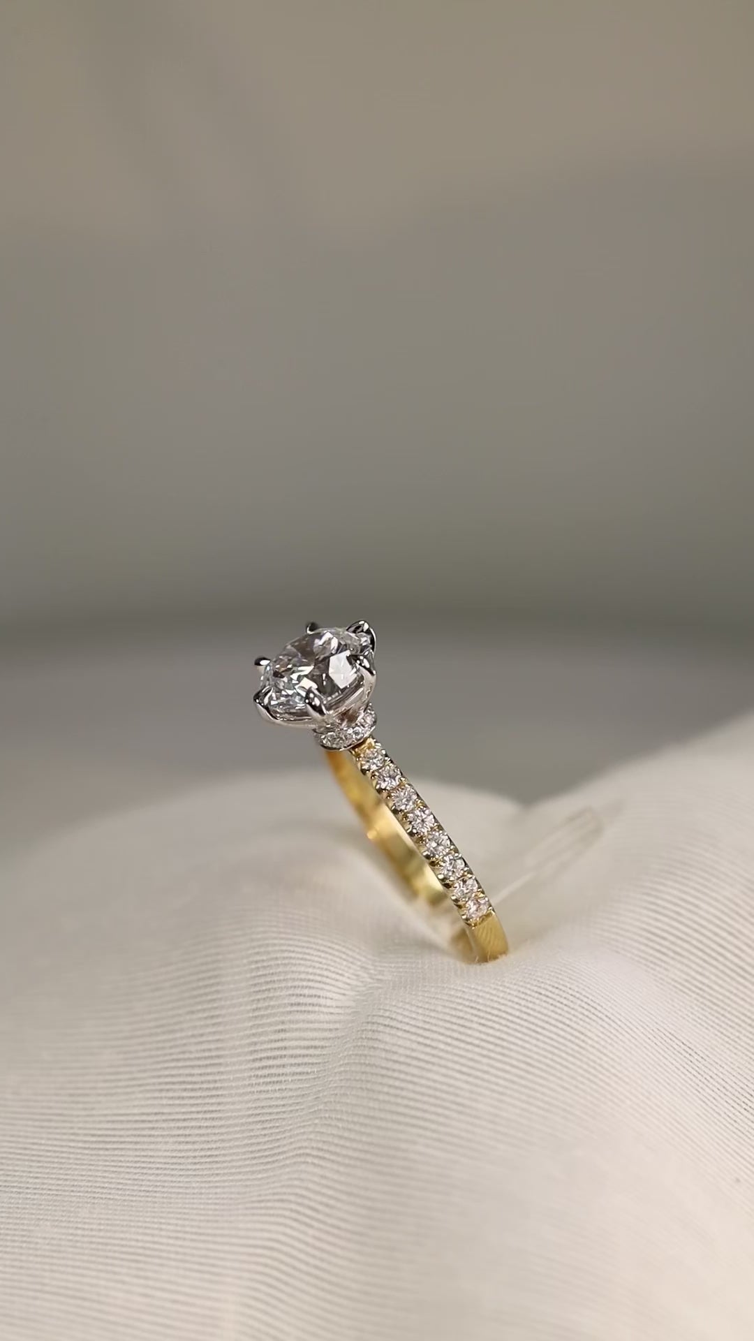 This luxurious custom-made setting features a stunning 18kt yellow gold band and radiant white gold claws, all carefully crafted with a bright polish finish. This piece showcases the finest in jewelry design and will make a sophisticated and exclusive statement.