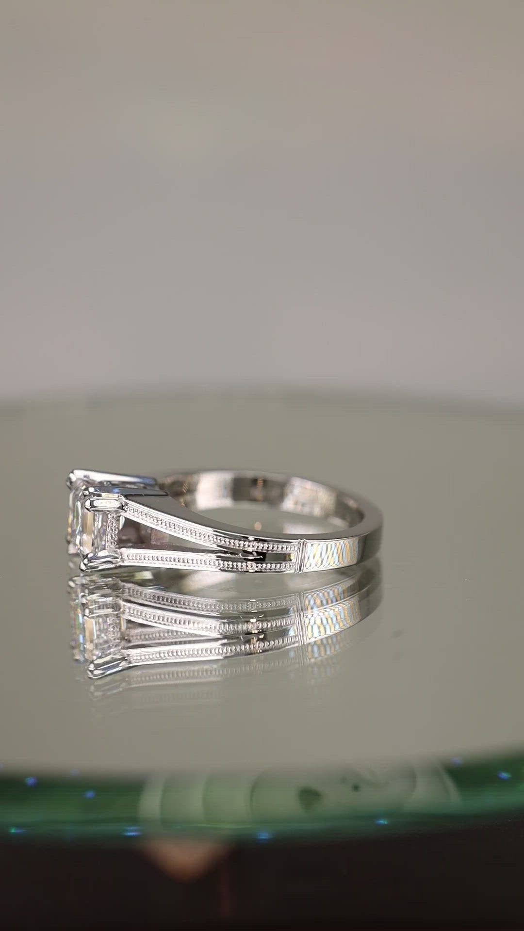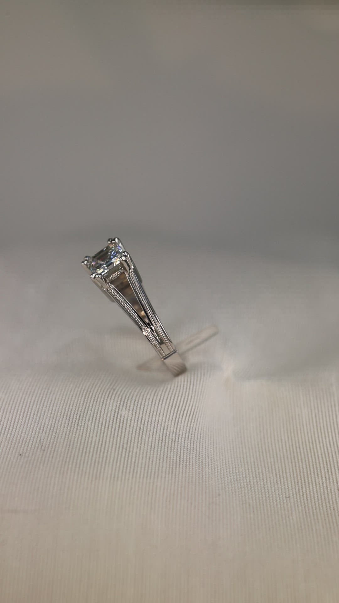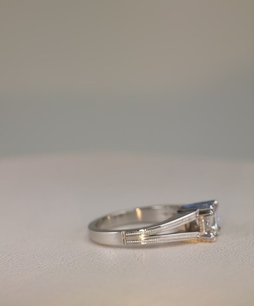 Elegant platinum millgrain split shank solitaire engagement ring with 1.0ct asscher cut center stone.